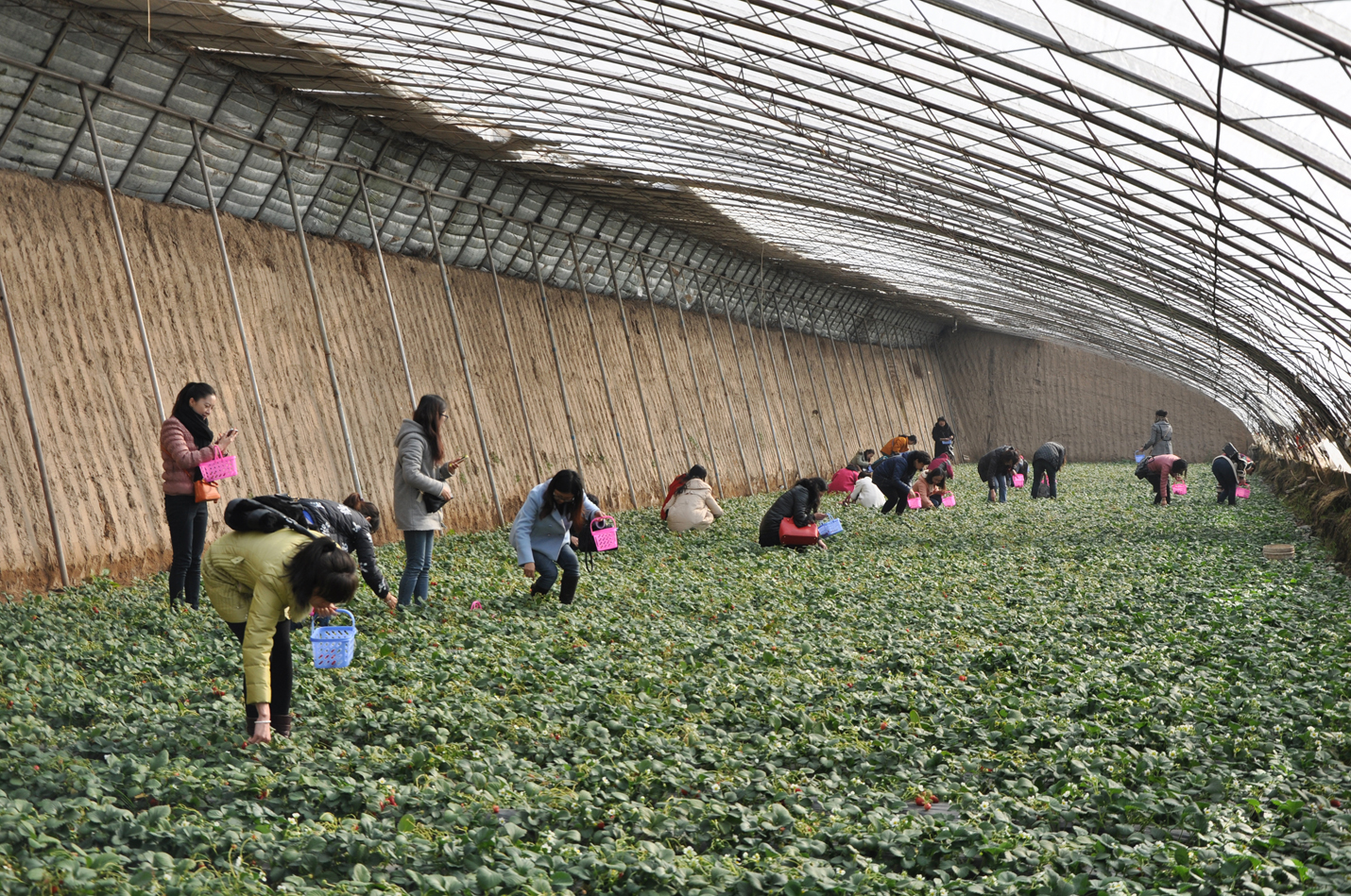 位于西寧市大堡子鄉(xiāng)陶北村的鄉(xiāng)趣園,占地面積500畝,園內有120棟日光節(jié)能溫室,冬季栽種有草莓、菜瓜、辣子、蘑菇、青菜等新鮮果蔬。進入大門,映入眼簾的是一派特色濃郁的鄉(xiāng)土文化和新穎別致的農家小院。大家高高興興地集中在一起,黨辦主任兼女工主任宋景娥首先簡要說了采摘活動的主要程序,隨后,園內工作人員帶著全體人員往采摘大棚走去。約一公里的鄉(xiāng)間小路,處處散發(fā)著鄉(xiāng)土的氣息,我們迎著羊年的嶄新朝陽,吮吸著少有的田間空氣,一會兒功夫,兩個外罩白塑料的溫室大棚赫然出現(xiàn)在眼前,這就是先要采摘的草莓大棚。每個人拎上分發(fā)的塑料筐,彎腰進入溫棚內。陽光透過塑料大棚,給本來就很潮熱的大棚如三亞之感,是呀!溫棚因這樣的溫度而造就,從室外到棚內,剛剛還是寒襲的冬季,一下子像是被空運到海南島似的。那凸凹有致的綠色田梗,星星點點的紅紅草莓躲藏在綠葉之中,零零散散的小白花陪伴著成熟的紅。這詩意的紅、綠、白,醉染著我們的身心,迫不及待的心拉下了忍不住的手,大家一會彎著,一會蹲著,累了站一會,馬上又繼續(xù)采摘……